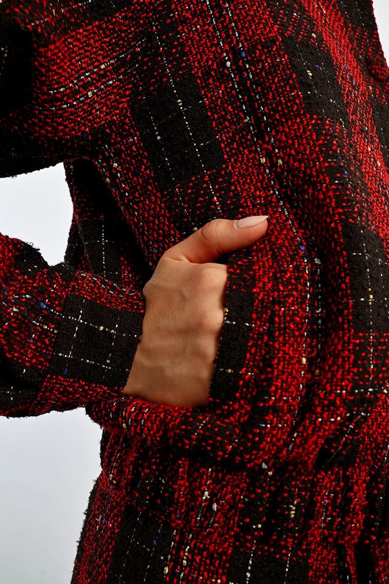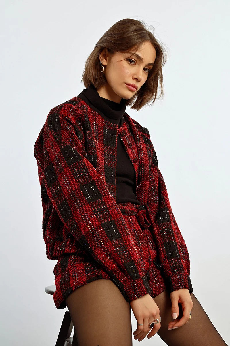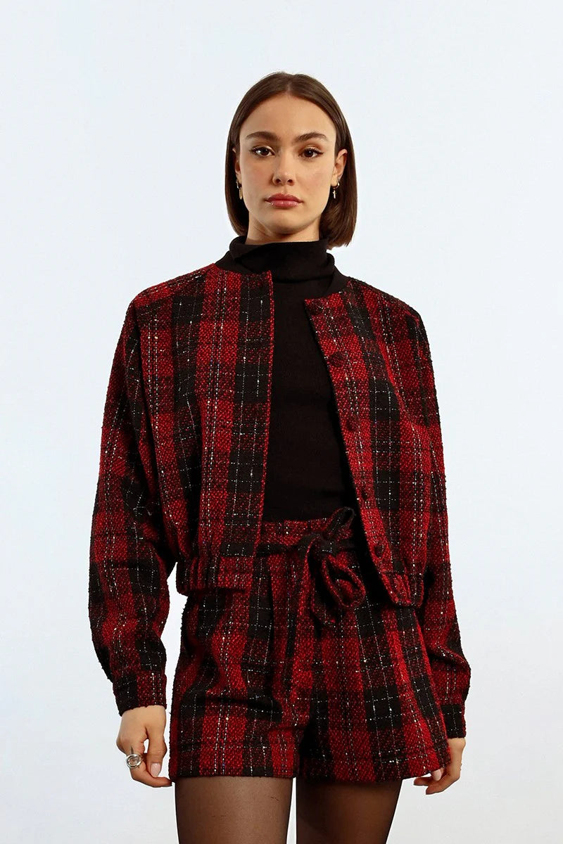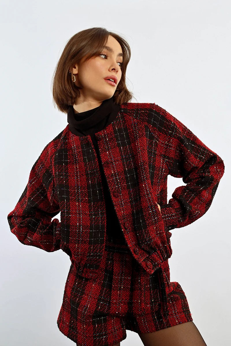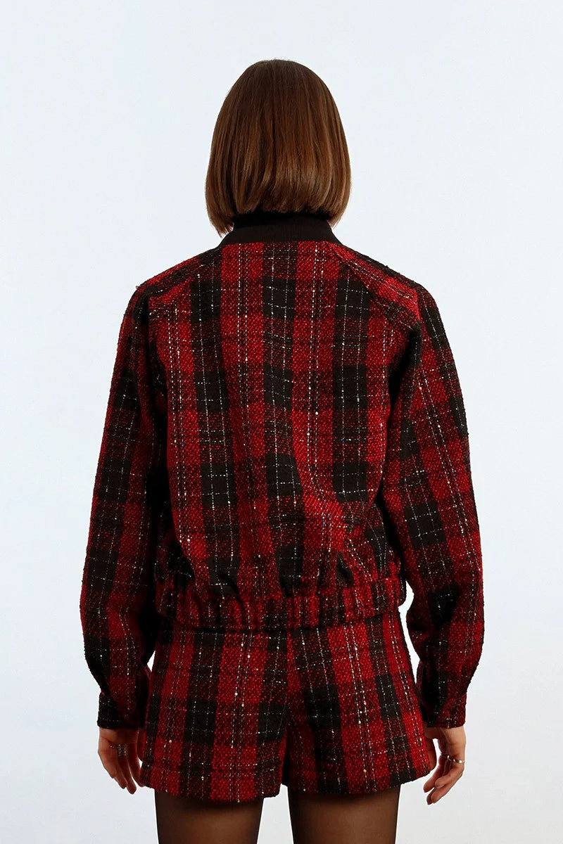 Giacca donna stile bomber a quadri maniche raglan polsini stretti