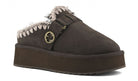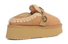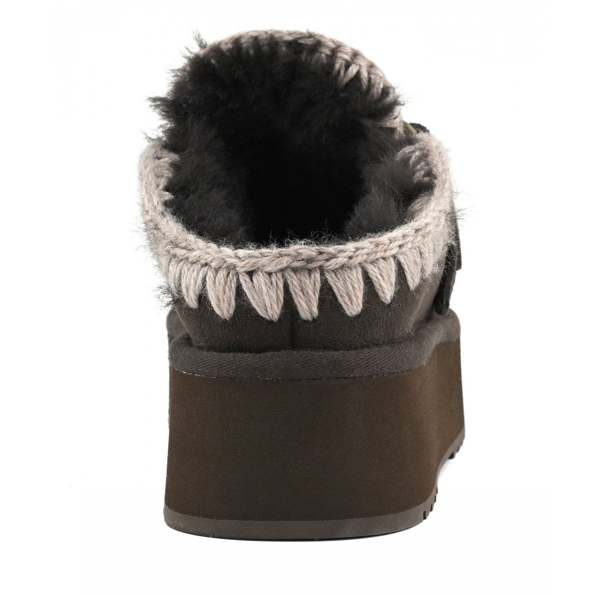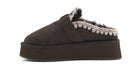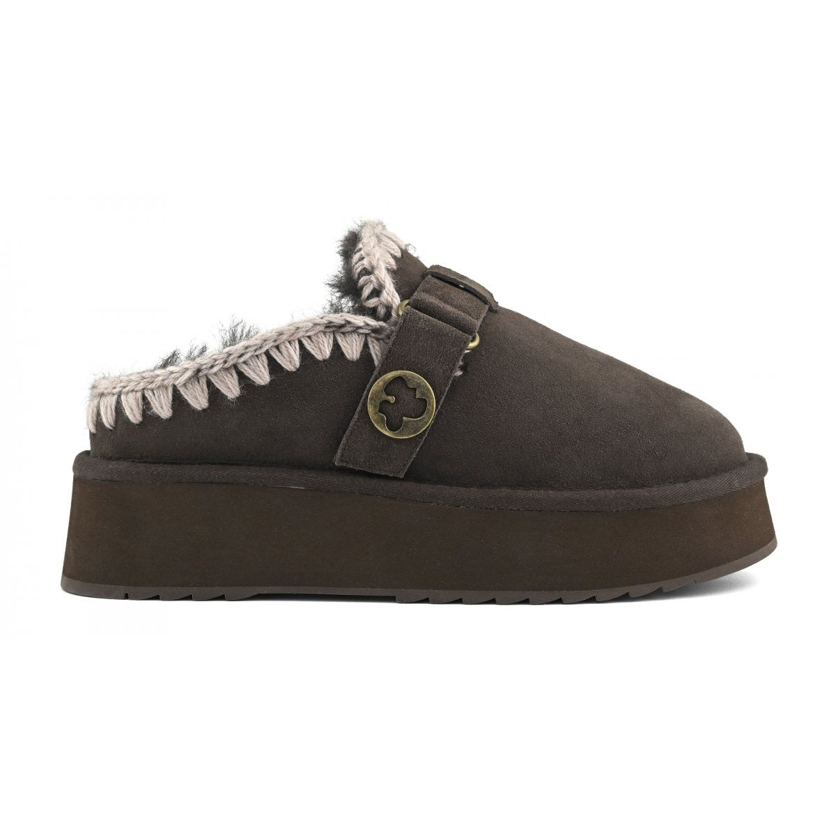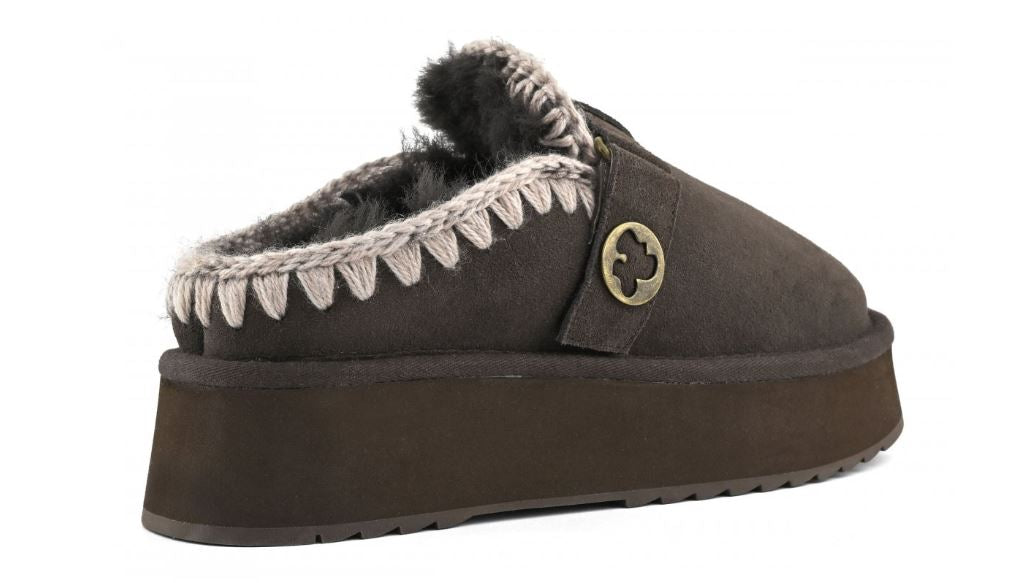 Ciabatta donna lo zoccolo con plateau con logo fibbia è una nuova simpatica aggiunta alla nostra collezione. Questa zeppa slip-on è sapientemente realizzata a mano in vera pelle di pecora double-face con cuciture in lana all'uncinetto a mano, marchio di fabbrica mou. Questo stile è incredibilmente comodo e resistente con suola in gomma EVA. Altezza 4 cm.