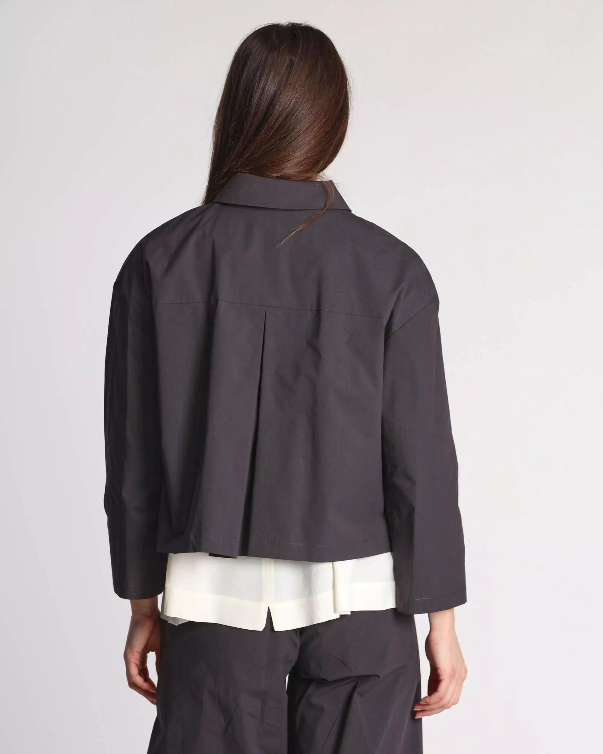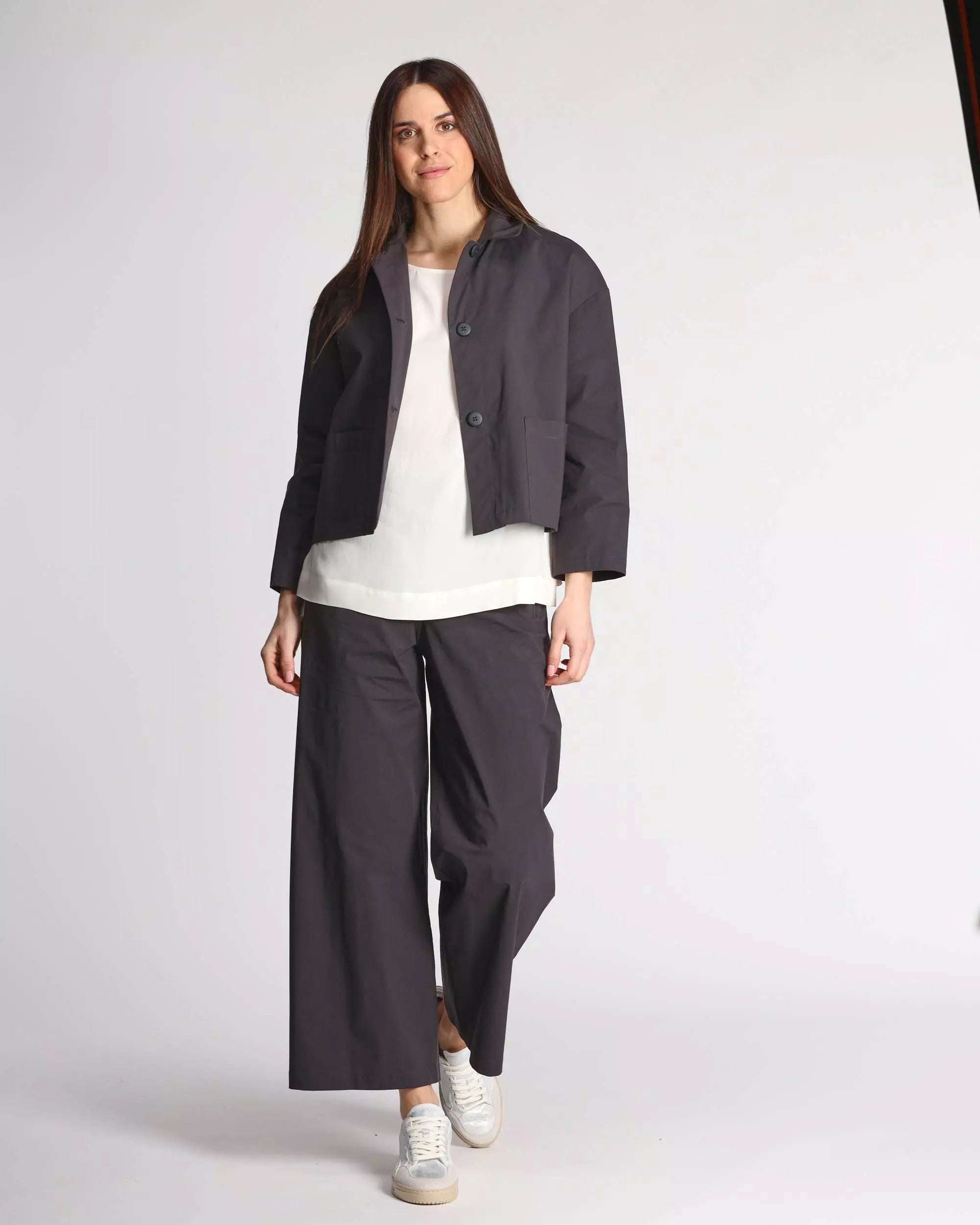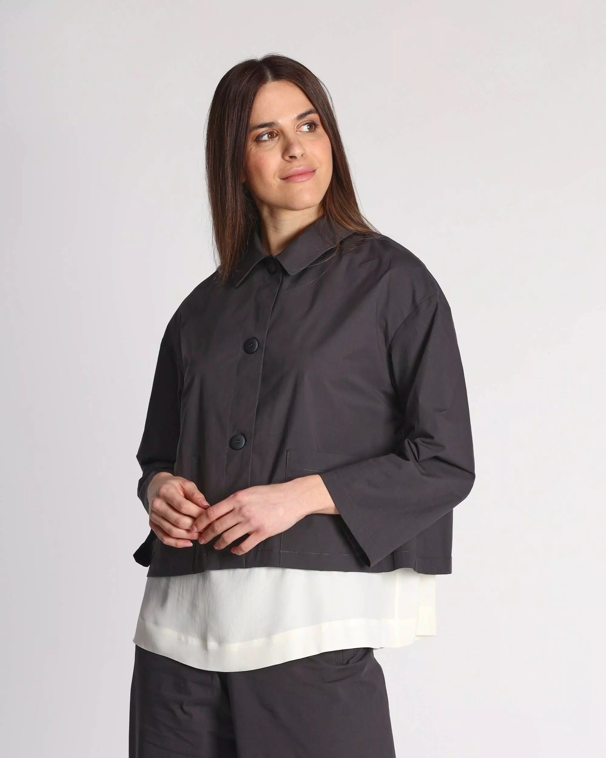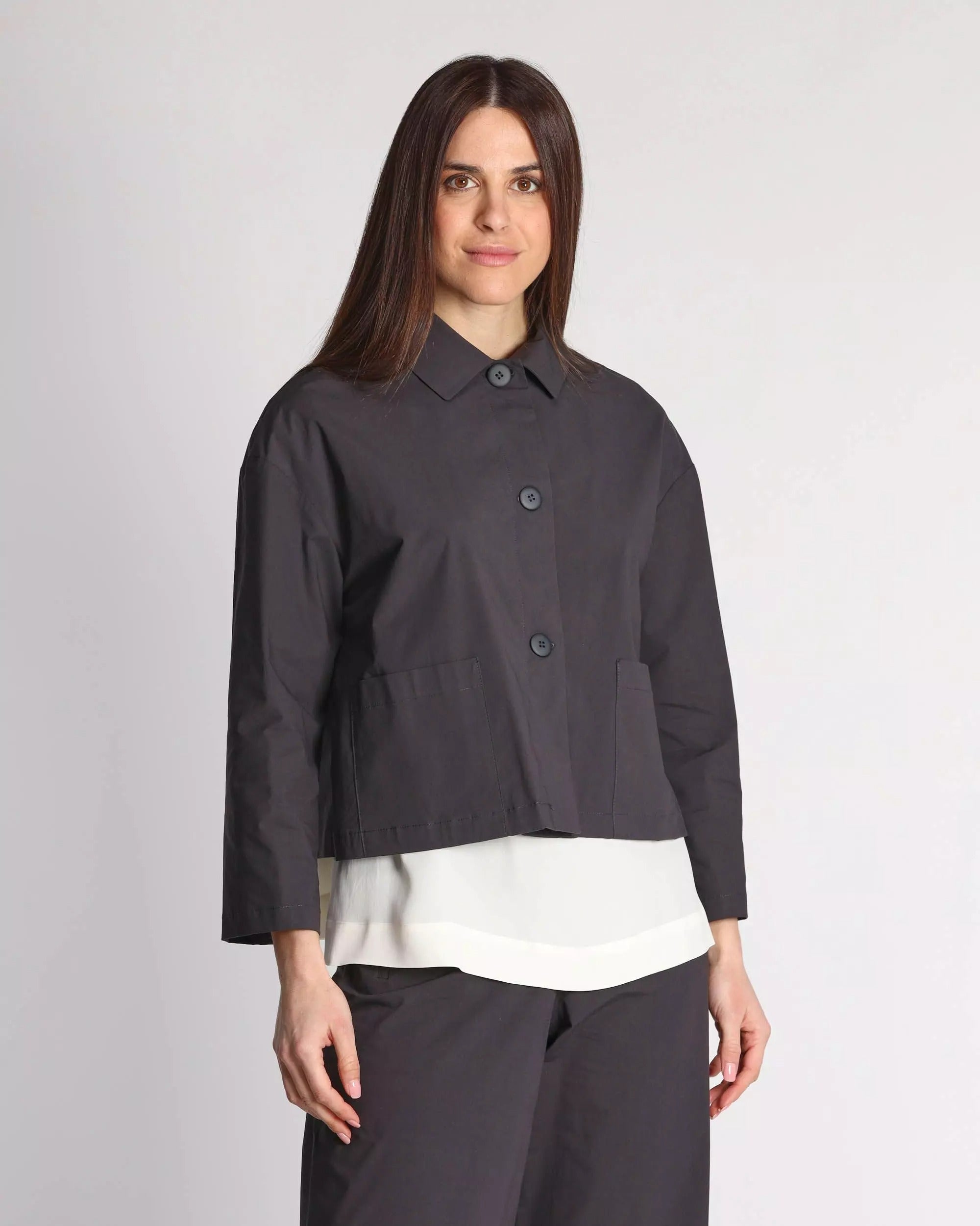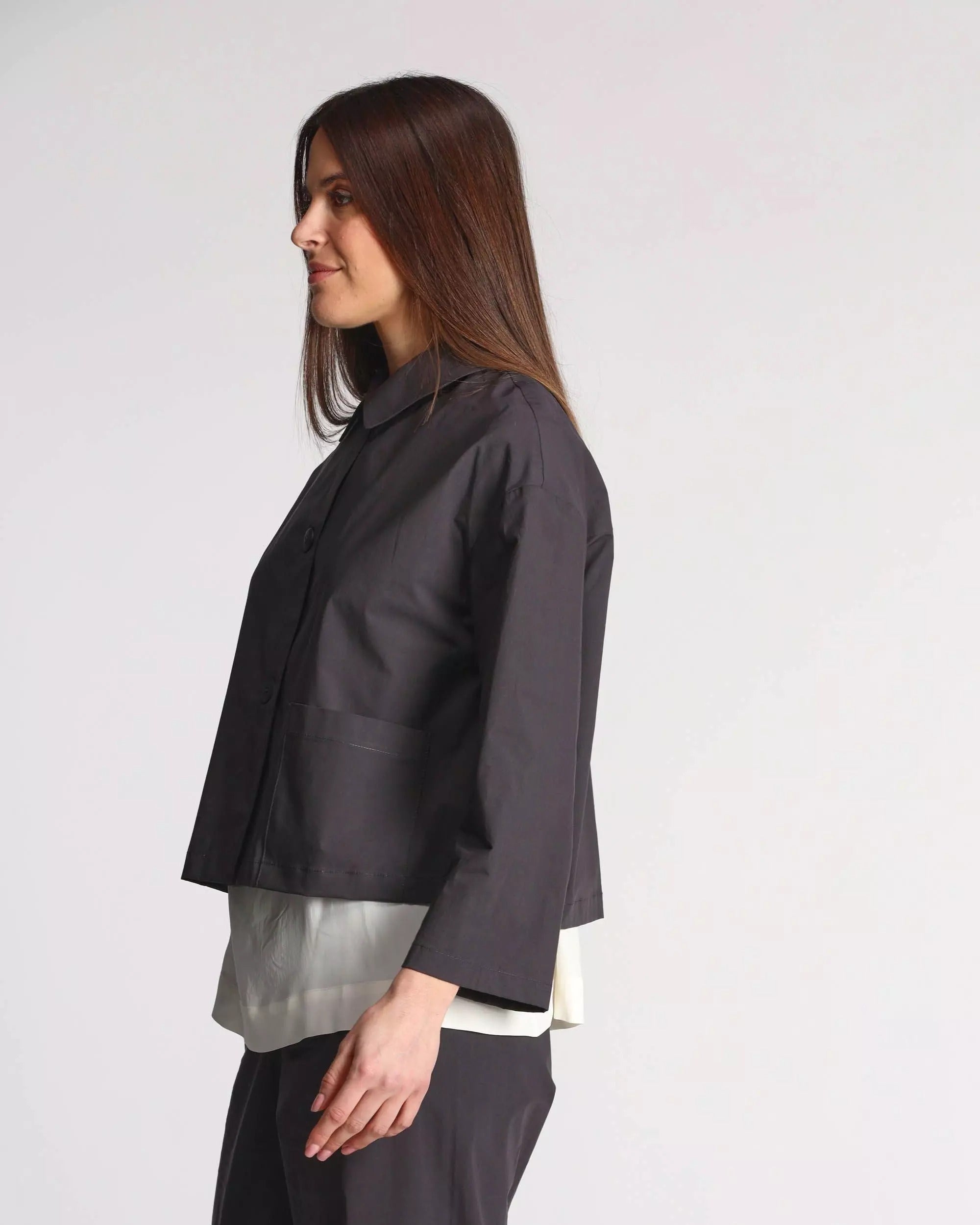 Giacca donna in cotone stretch, collo a camicia, maniche tre quarti, spalle scese, chiusura con bottoni, tasche applicate, sfoderata, linea dritta