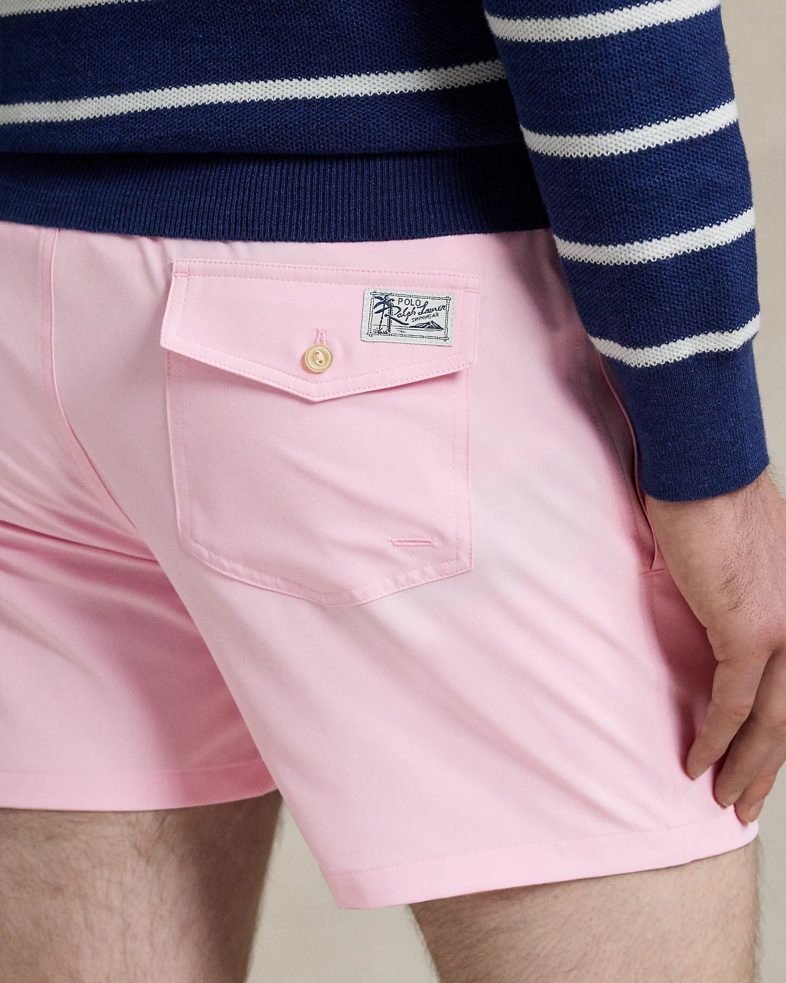 Tasche laterali all'americana. Tasca con bottone sul lato posteriore destro. Etichetta "Polo Ralph Lauren Swimwear" sulla tasca posteriore.