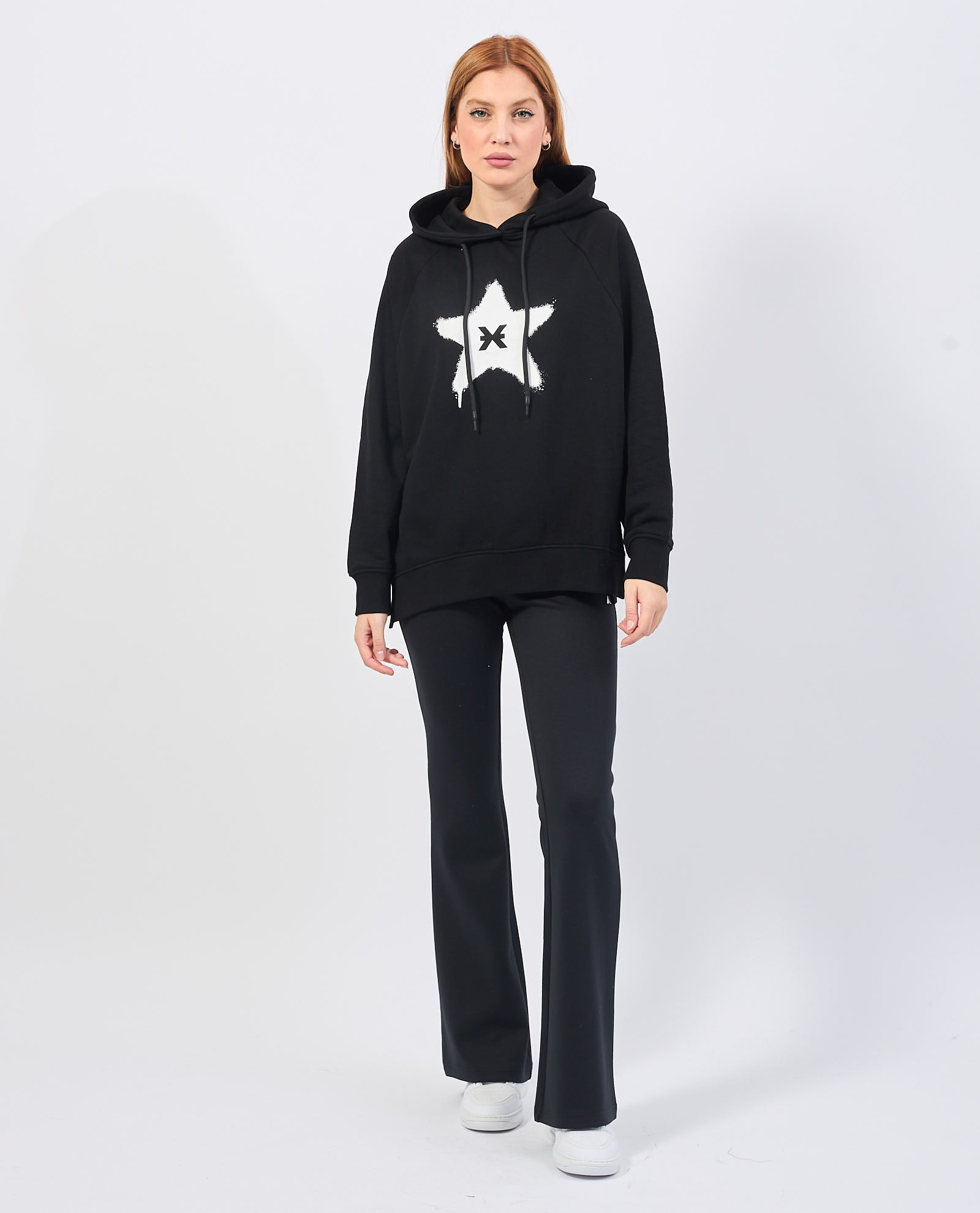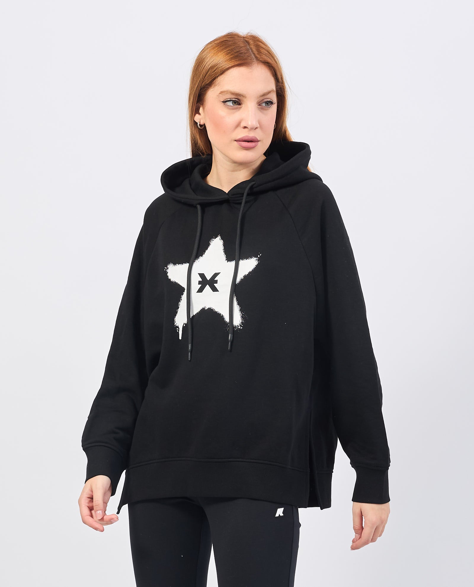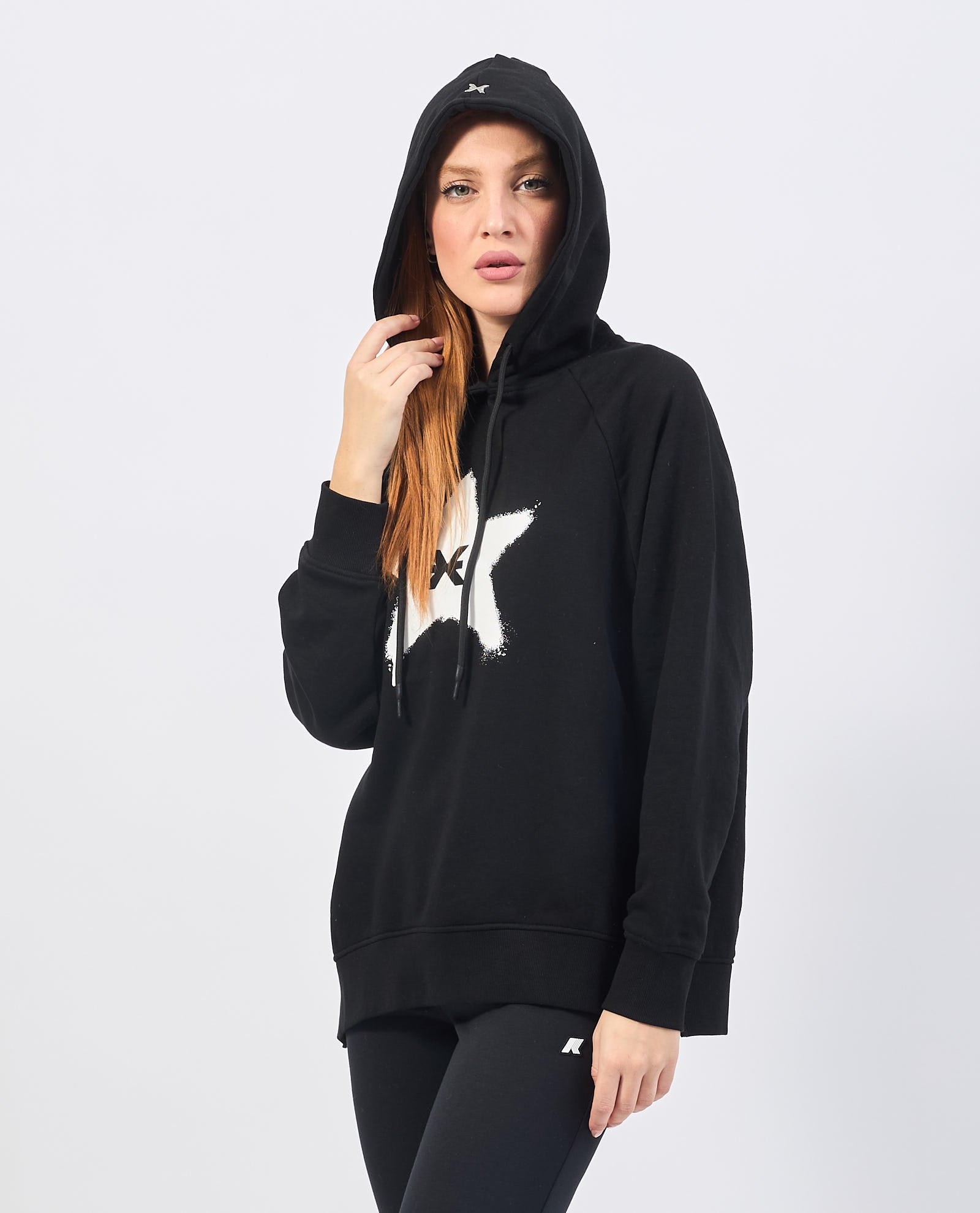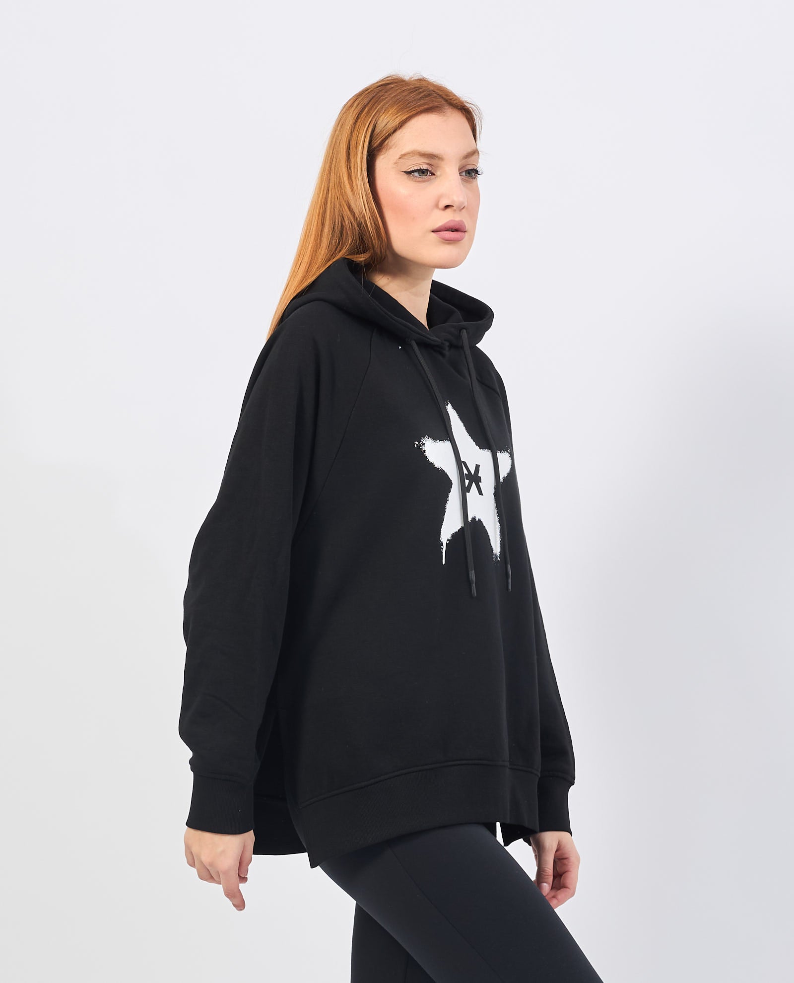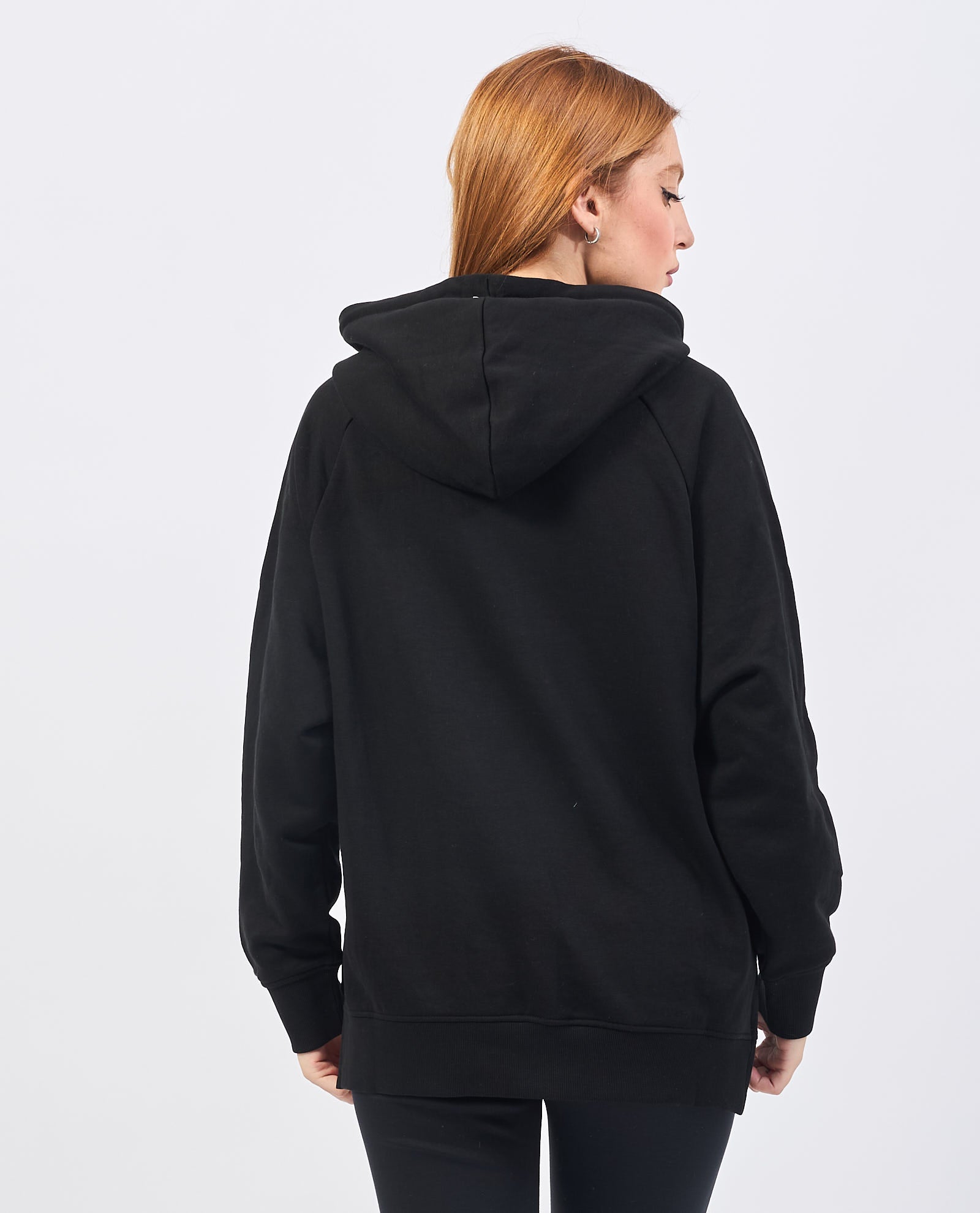 Felpa da donna firmata Richmond X modello con cappuccio coulisse regolabile e logo stampato sul davanti, tagli laterali e vestibilità comoda polsi a costine spacchi laterali