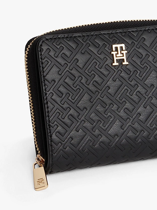 Portafoglio donna dalla pratica chiusura con zip, presenta una texture con monogrammi TH in rilievo e un interno ben organizzato, con scomparti separati per banconote e carte.