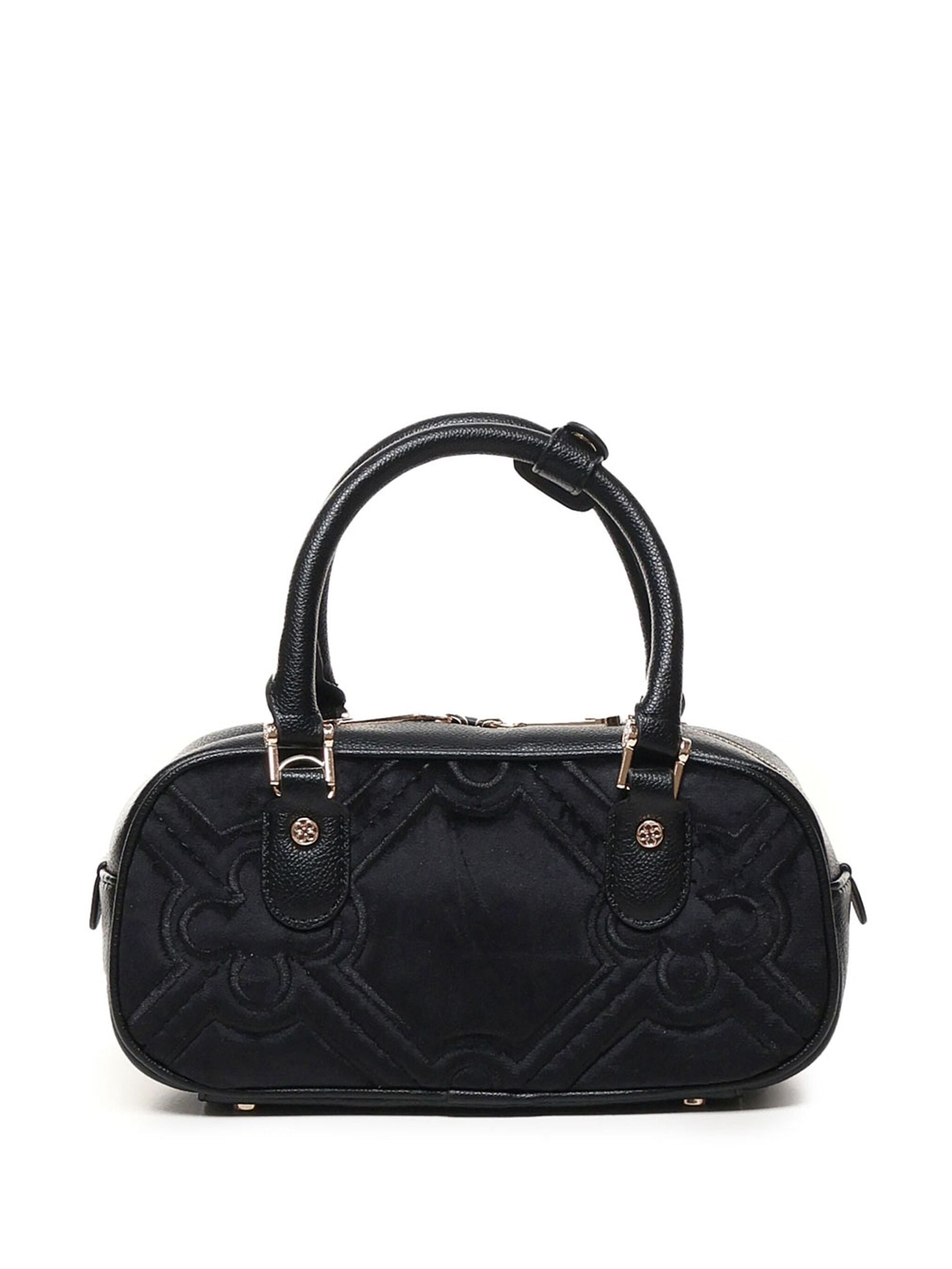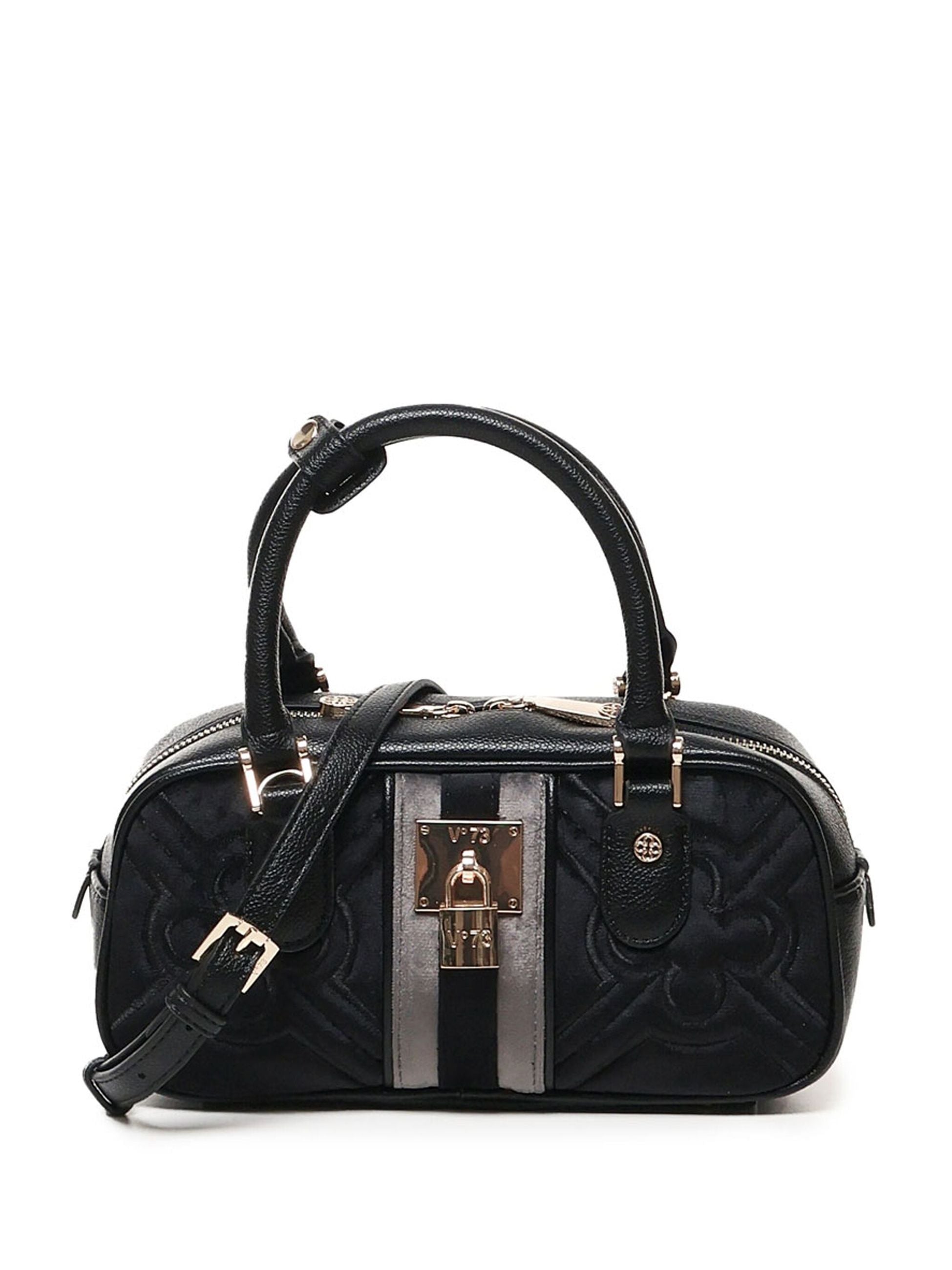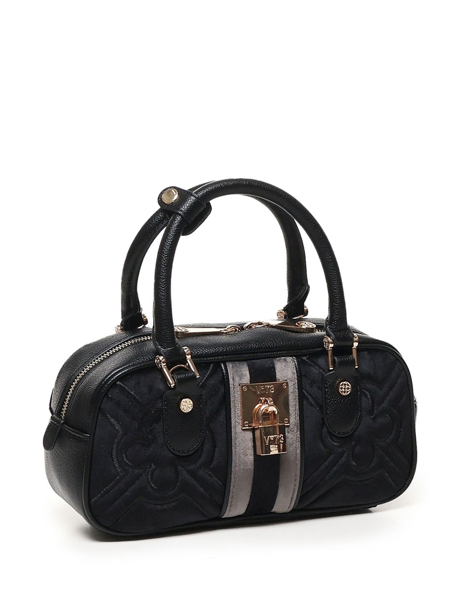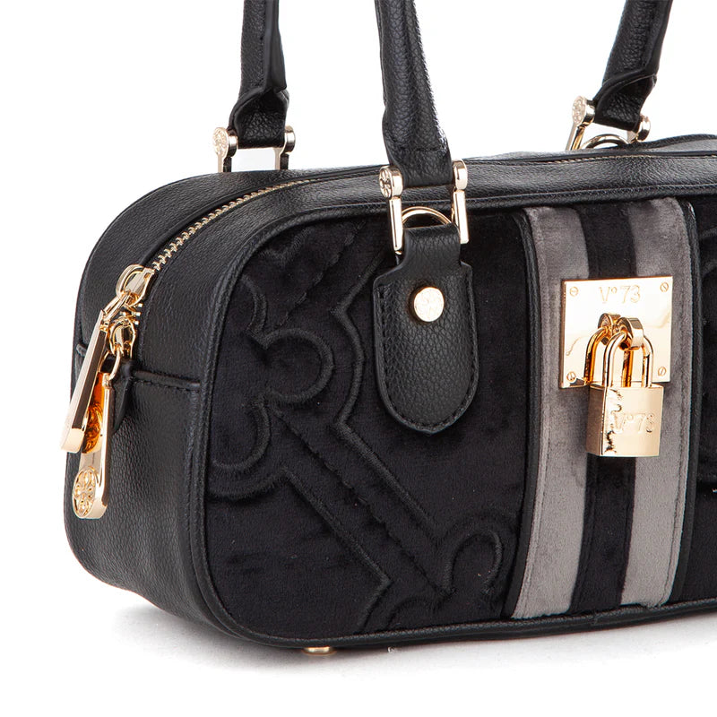 Borsa donna a mano realizzata in velluto con riporti in grana, ricamata con maxi all over V73. Fascia centrale bicolore e lucchetto personalizzato. Chiusura con cerniera. In aggiunta una tracolla removibile per una doppia portabilità undefined