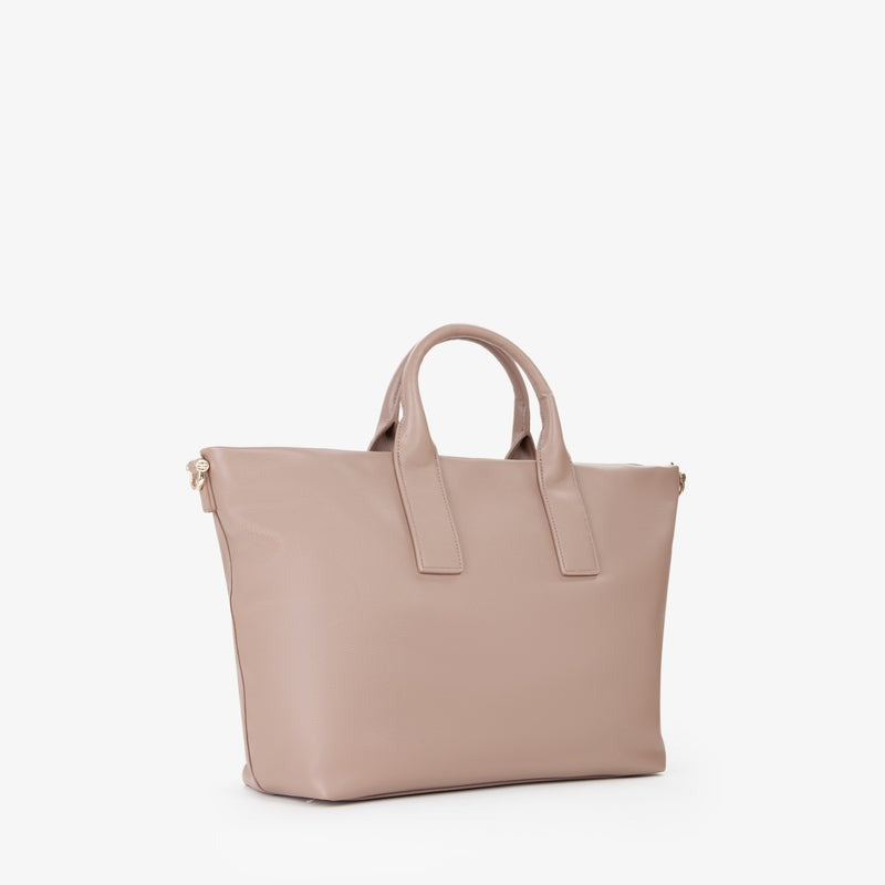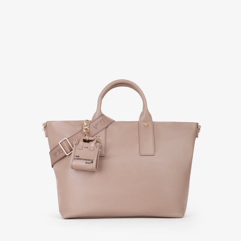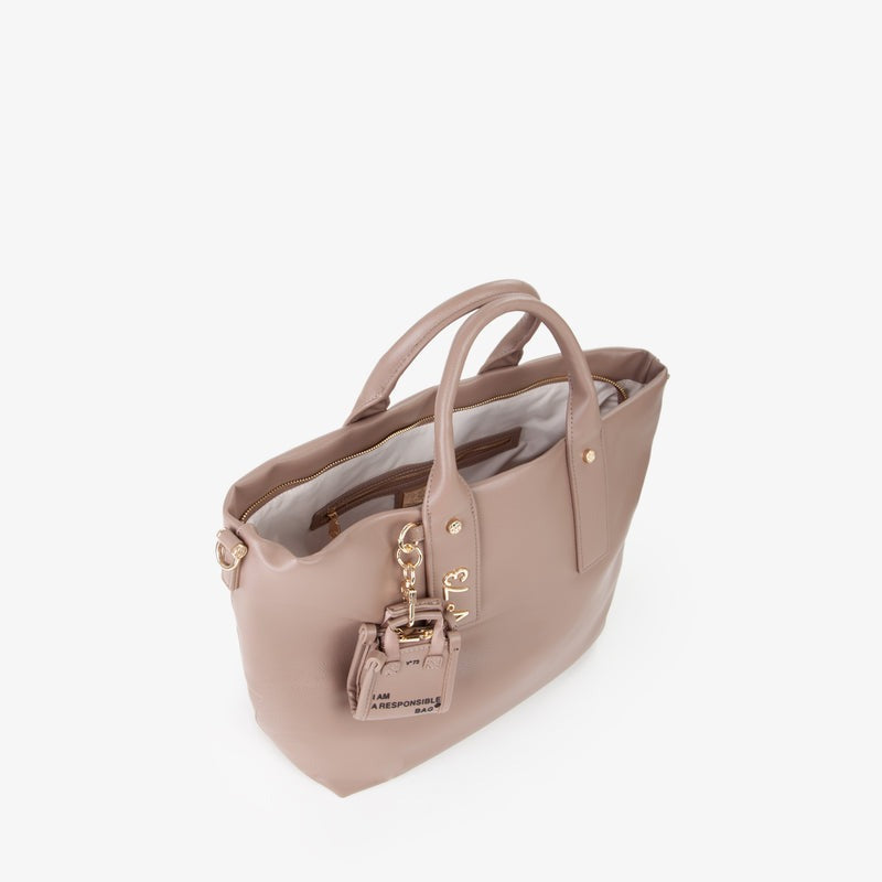 Borsa donna realizzata in nappa riciclata. Impreziosita da charm mini bag con iconica scritta I am a responsible bag. Con tracolla in tessuto completamente logata con due tasche interne