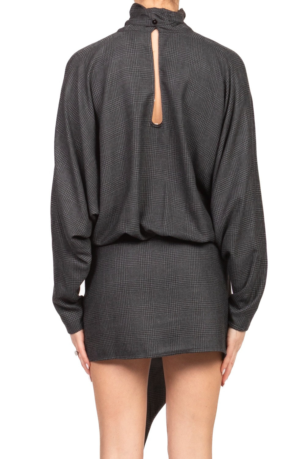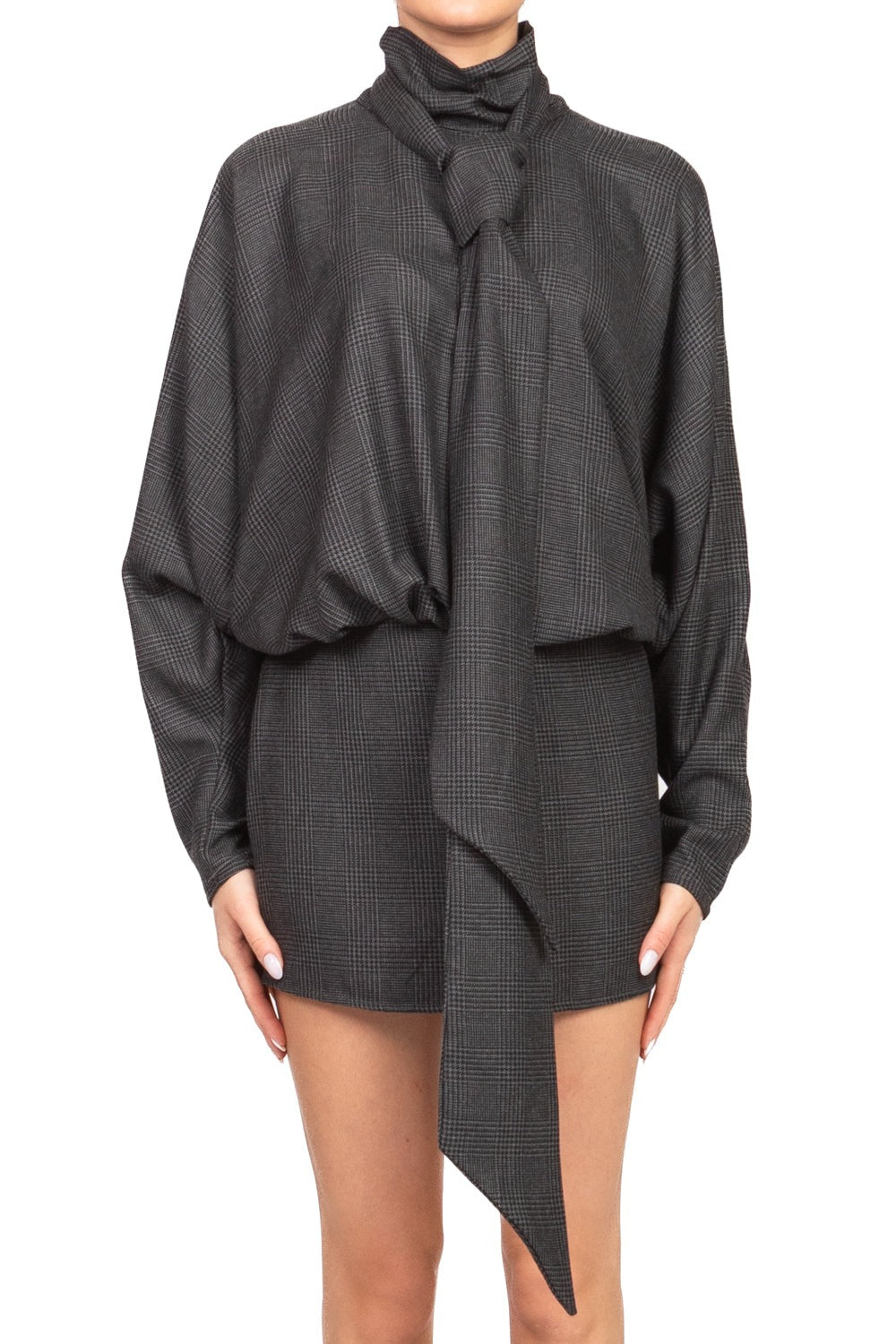 Abito donna femminile e sofisticato, questo abito corto in fantasia Principe di Galles presenta un top morbido con maniche ampie e un colletto che si annoda in un fiocco delicato. La chiusura posteriore con asola e bottoncino aggiunge un tocco raffinato, mentre la parte della gonna dal taglio asciutto bilancia perfettamente i volumi del capo. Un abito ideale per occasioni speciali o look da giorno ricercati.