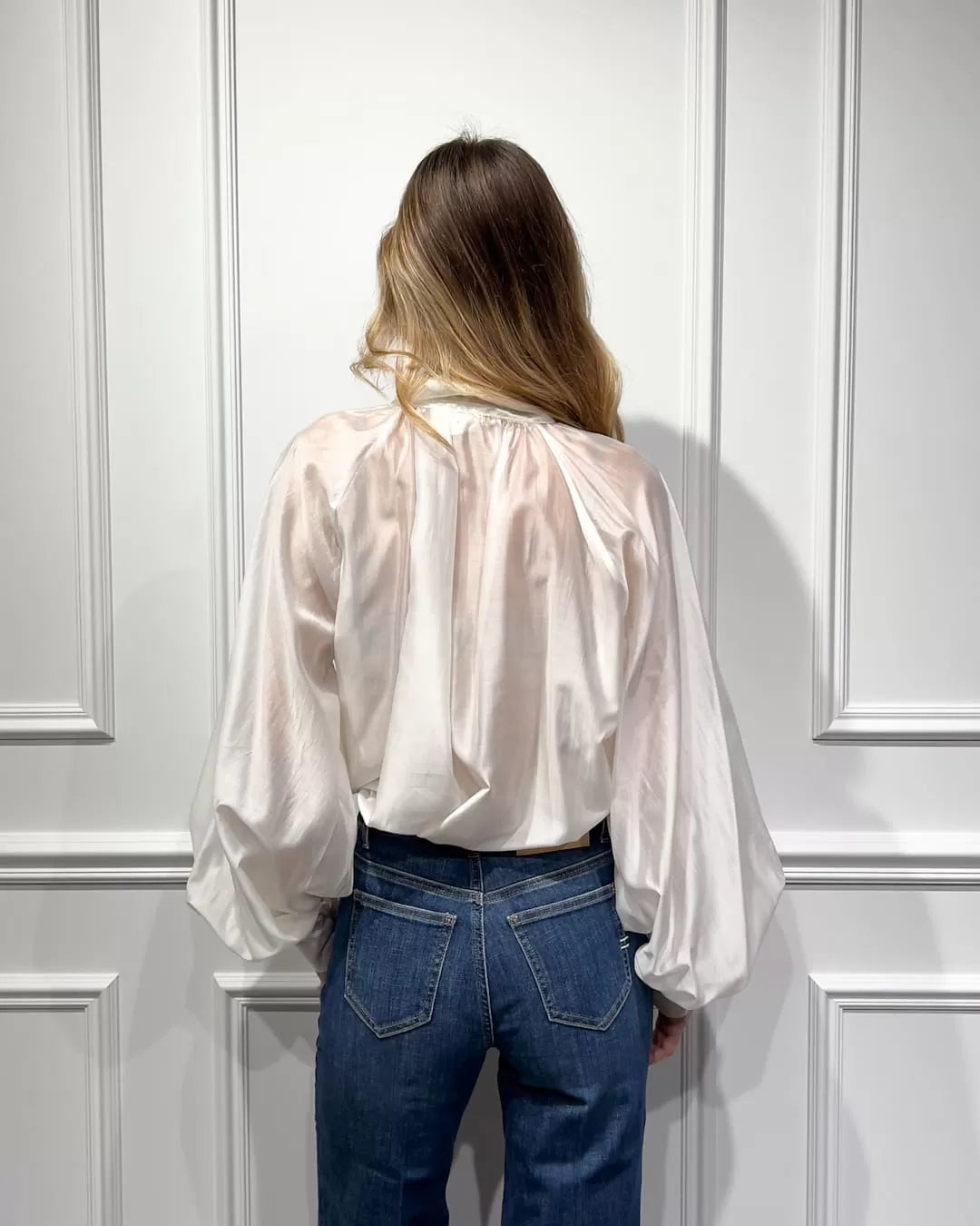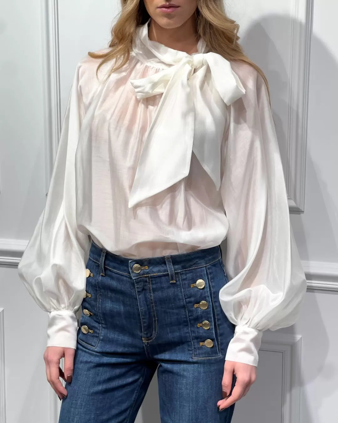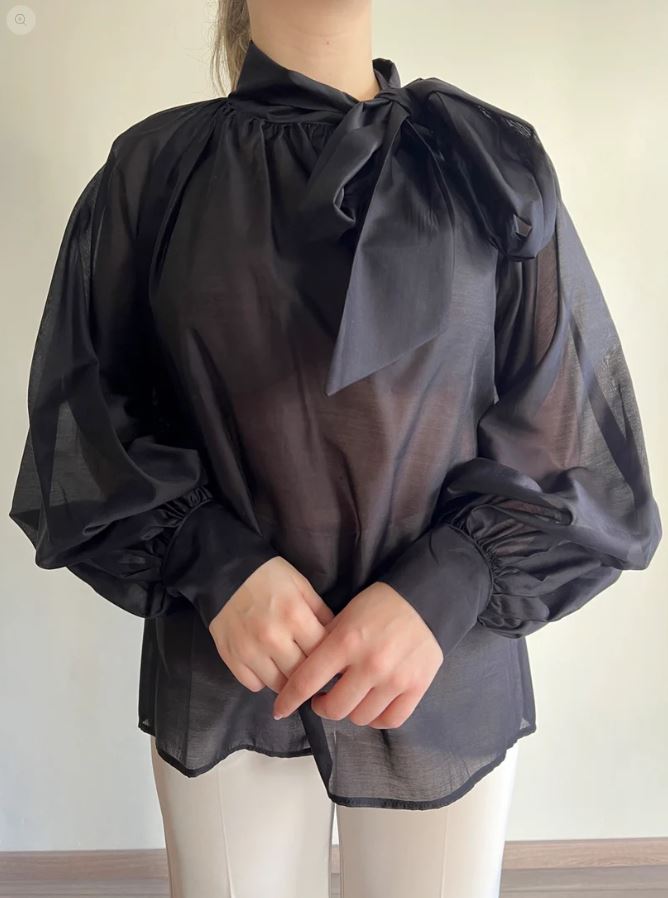 La blusa della collezione primavera/estate di Vicolo è caratterizzata dalla vestibilità morbida con collo alto e fiocco e presenta manica raglan a palloncino.