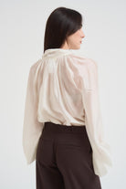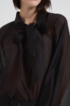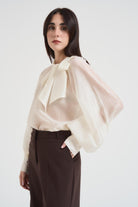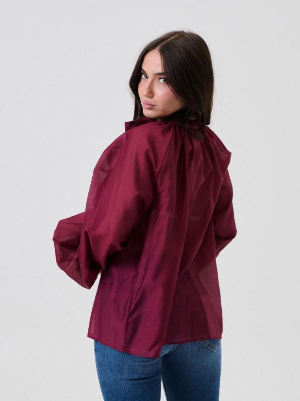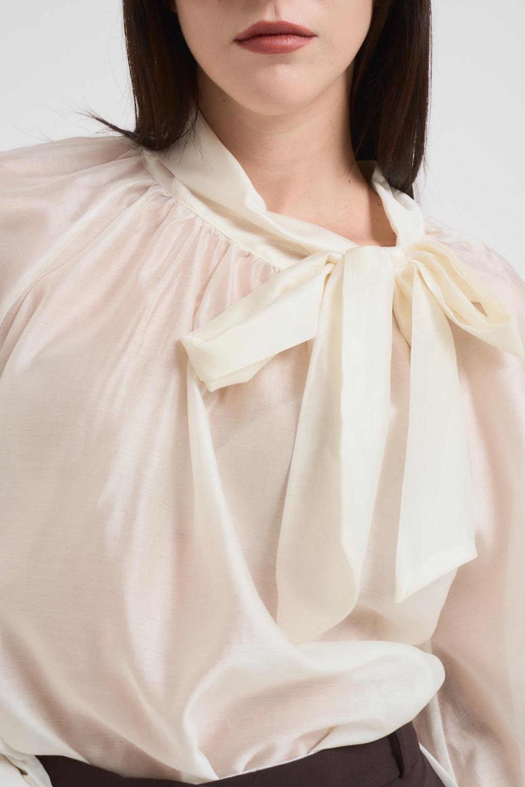 VICOLO Blusa da donna dal taglio fluido e leggermente trasparente. Presenta maniche lunghe ampie con polsini alti e bottoni, collo con fiocco annodato sul davanti che aggiunge un tocco romantico e sofisticato. Il fit morbido e il tessuto impalpabile la rendono perfetta per look eleganti o da ufficio, abbinata a gonne o pantaloni a vita alta. La modella indossa una taglia S ed è alta 170cm. Si consiglia un lavaggio ed una stiratura a media temperatura. Stagione autunno inverno.
