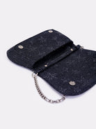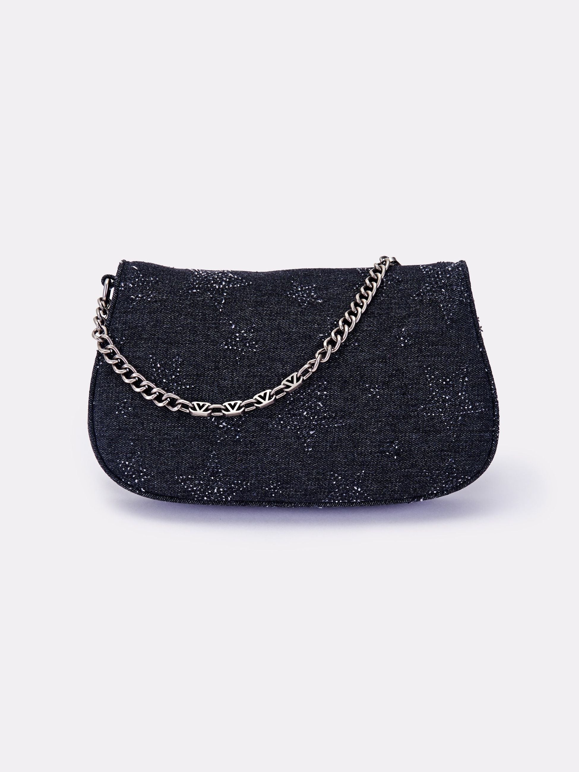 Borsa donna Butterfly a spalla in tessuto denim nero con floccature a forma di stella. Chiusura con bottoni a pressione con calamita. Dettaglio logo metal plate Vicolo frontale. Finiture anticate color argento. Tracolla con catena scorrevole removibile. La borsa può essere indossata sia come borsa a spalla che come borsa a mano. Scomparto interno in tessuto con taschina con cerniera. Dettaglio catena logata Vicolo.