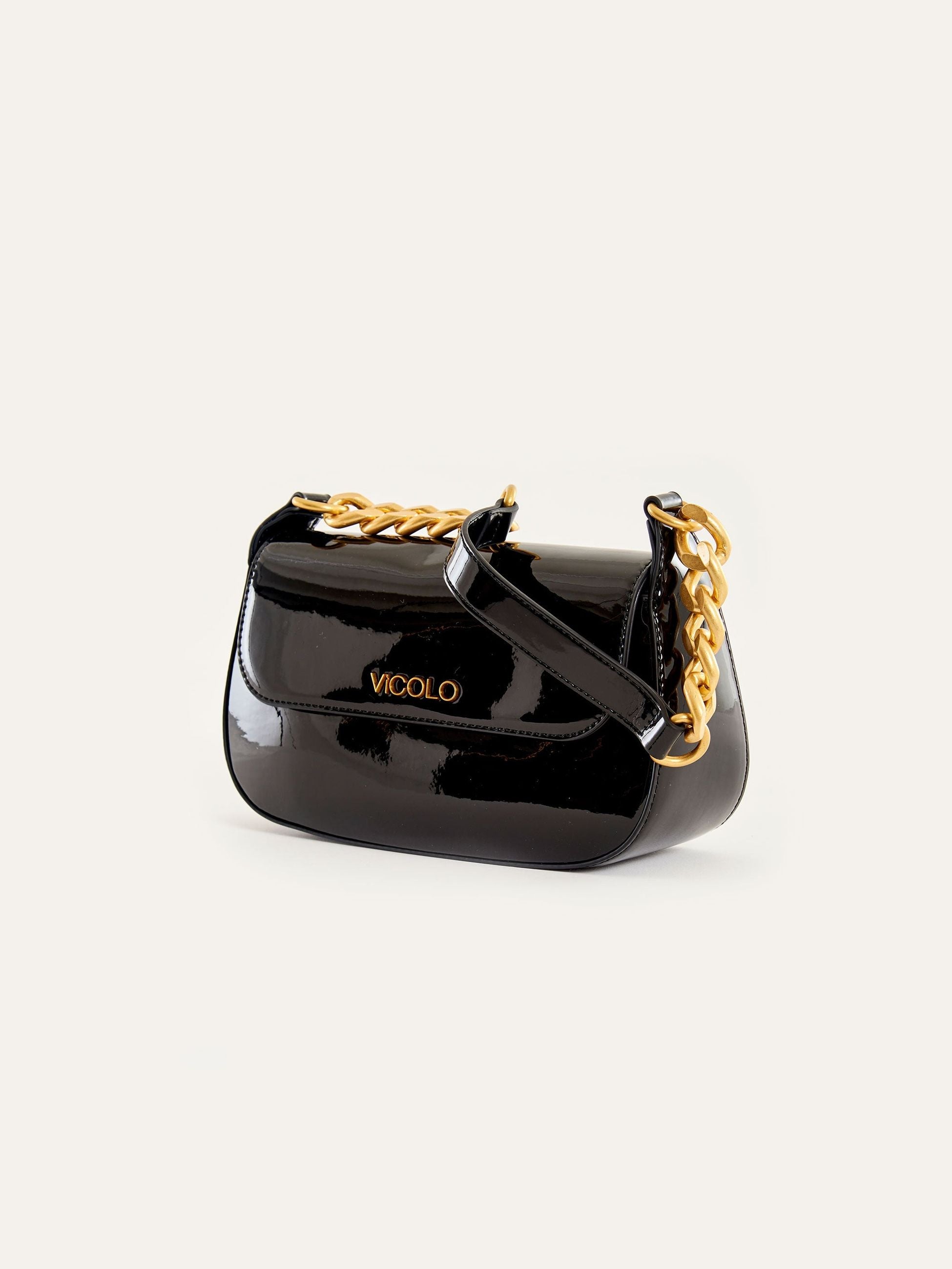 Borsa donna Piccadilly a spalla in ecopelle verniciata. Manico in similpelle con catena. Chiusura con bottone a pressione con calamita. Dettaglio logo metal plate Vicolo. Finiture anticate color oro. Tasca interna con cerniera e taschina piatta.