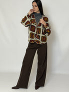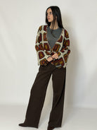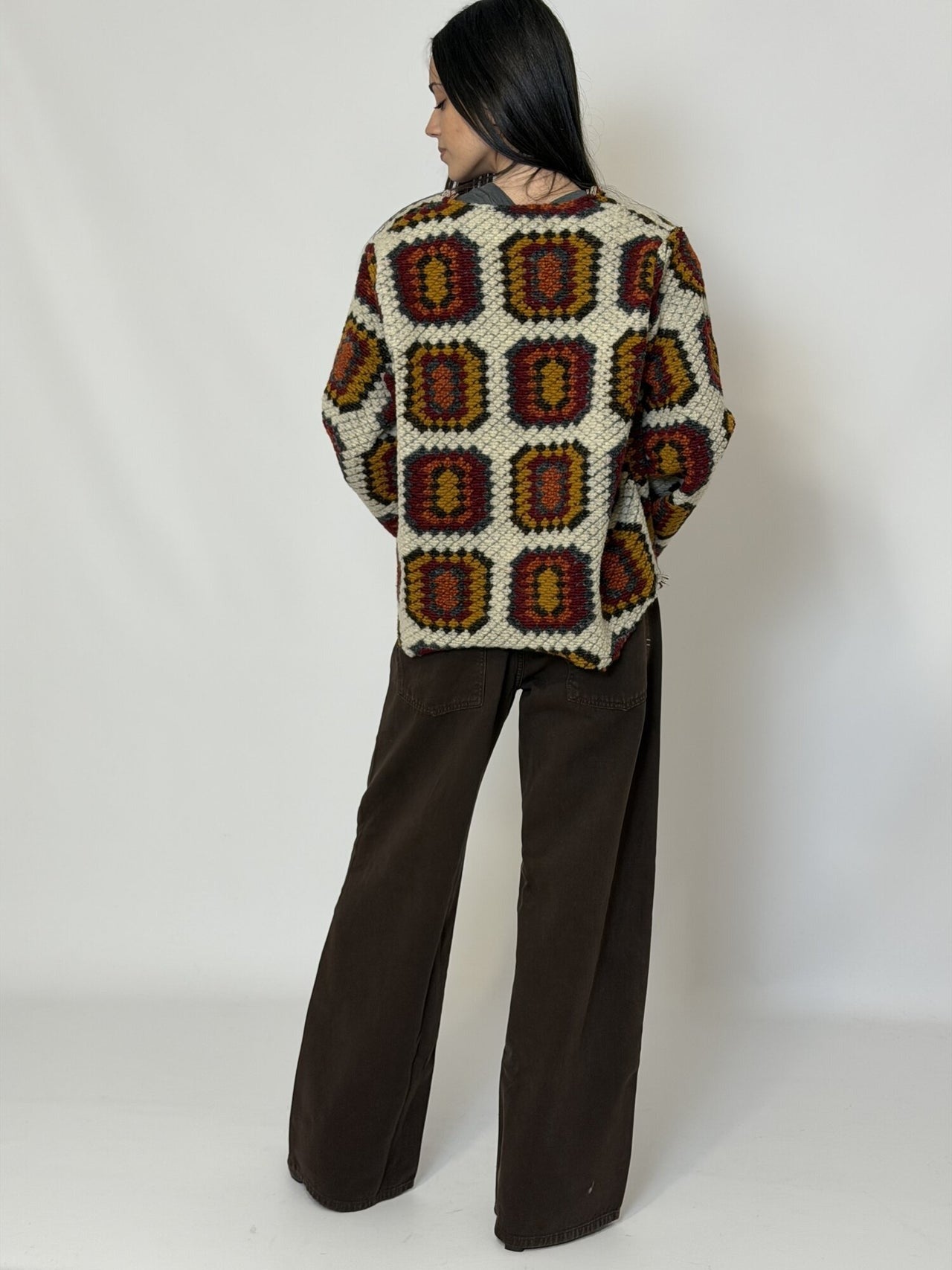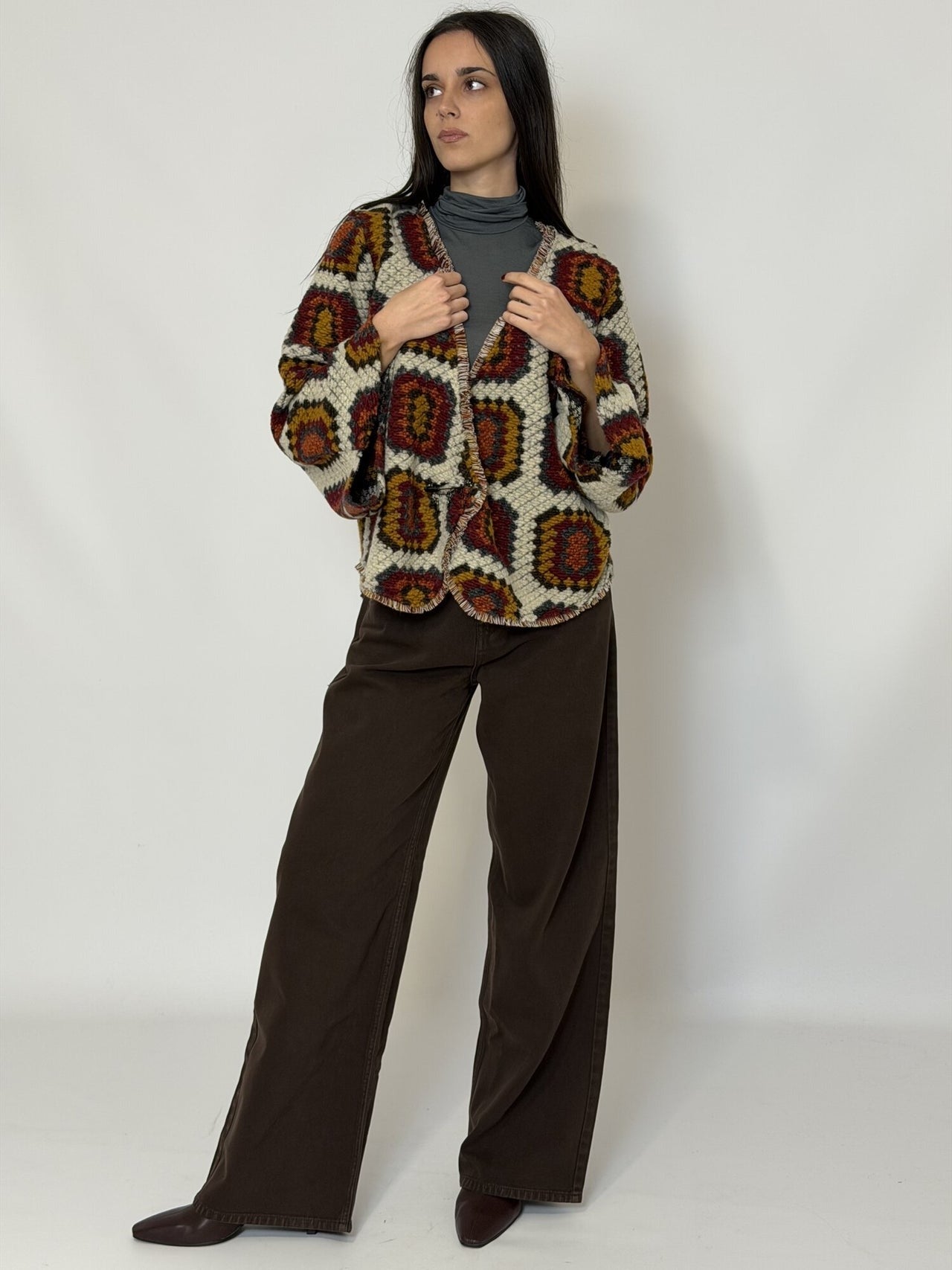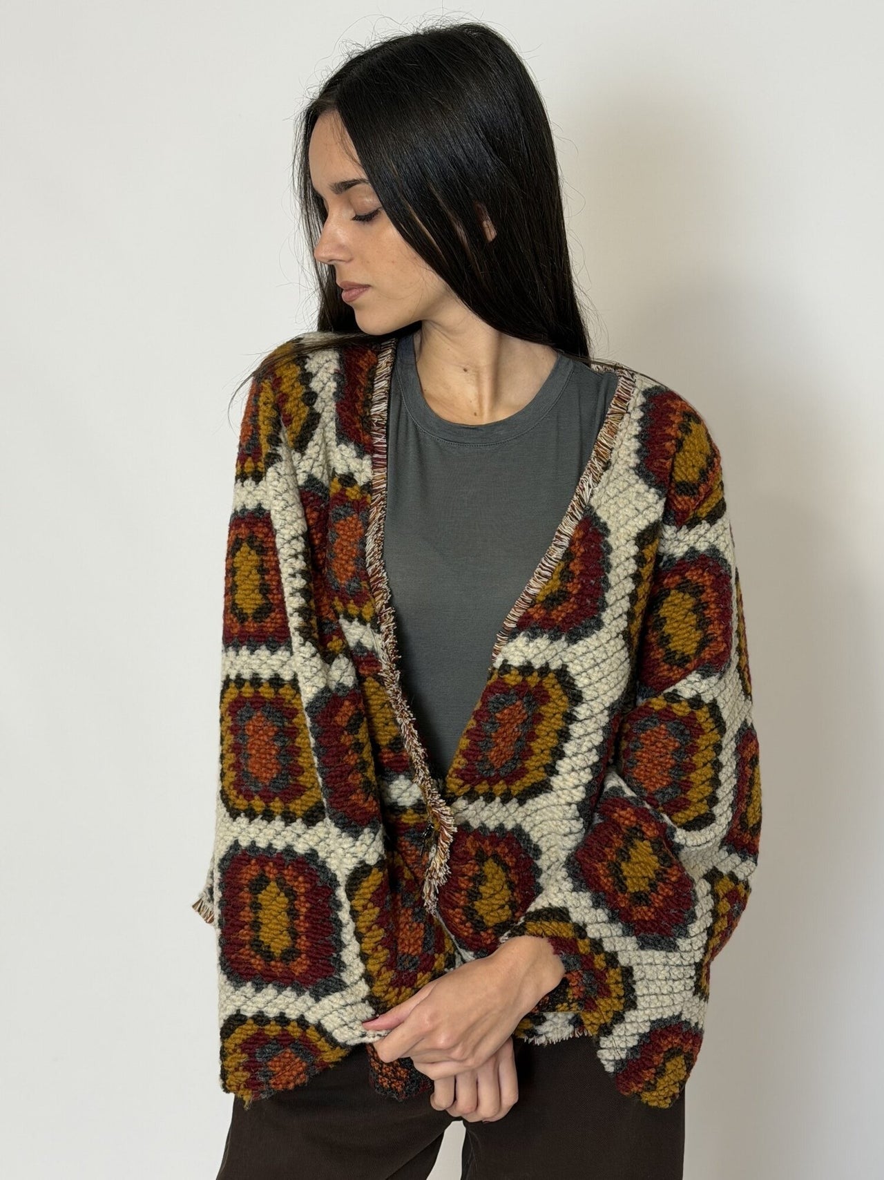 Cardigan donna over a fantasia azteca con maniche ampie e chiusura con spilla.
