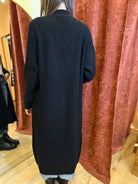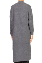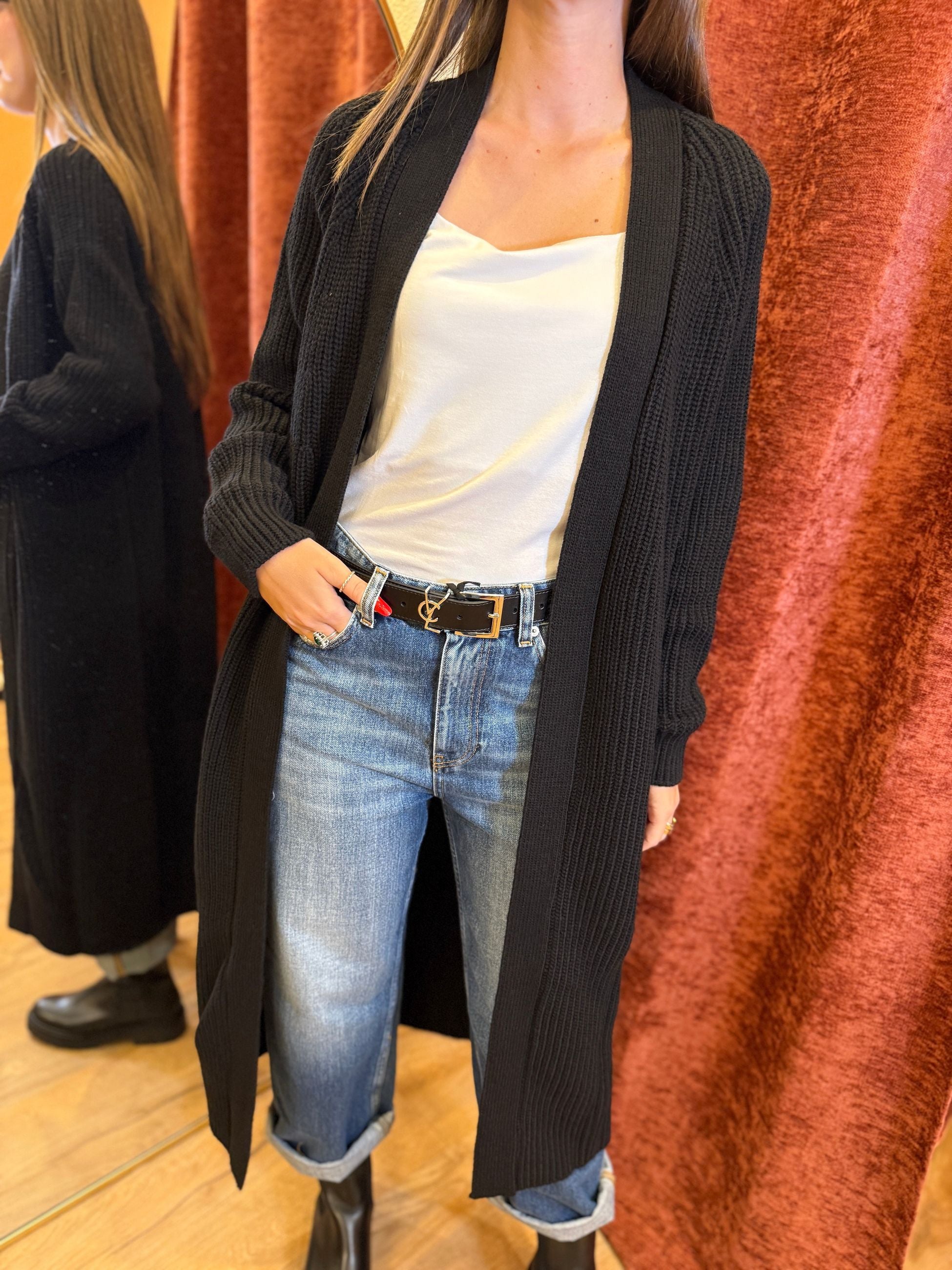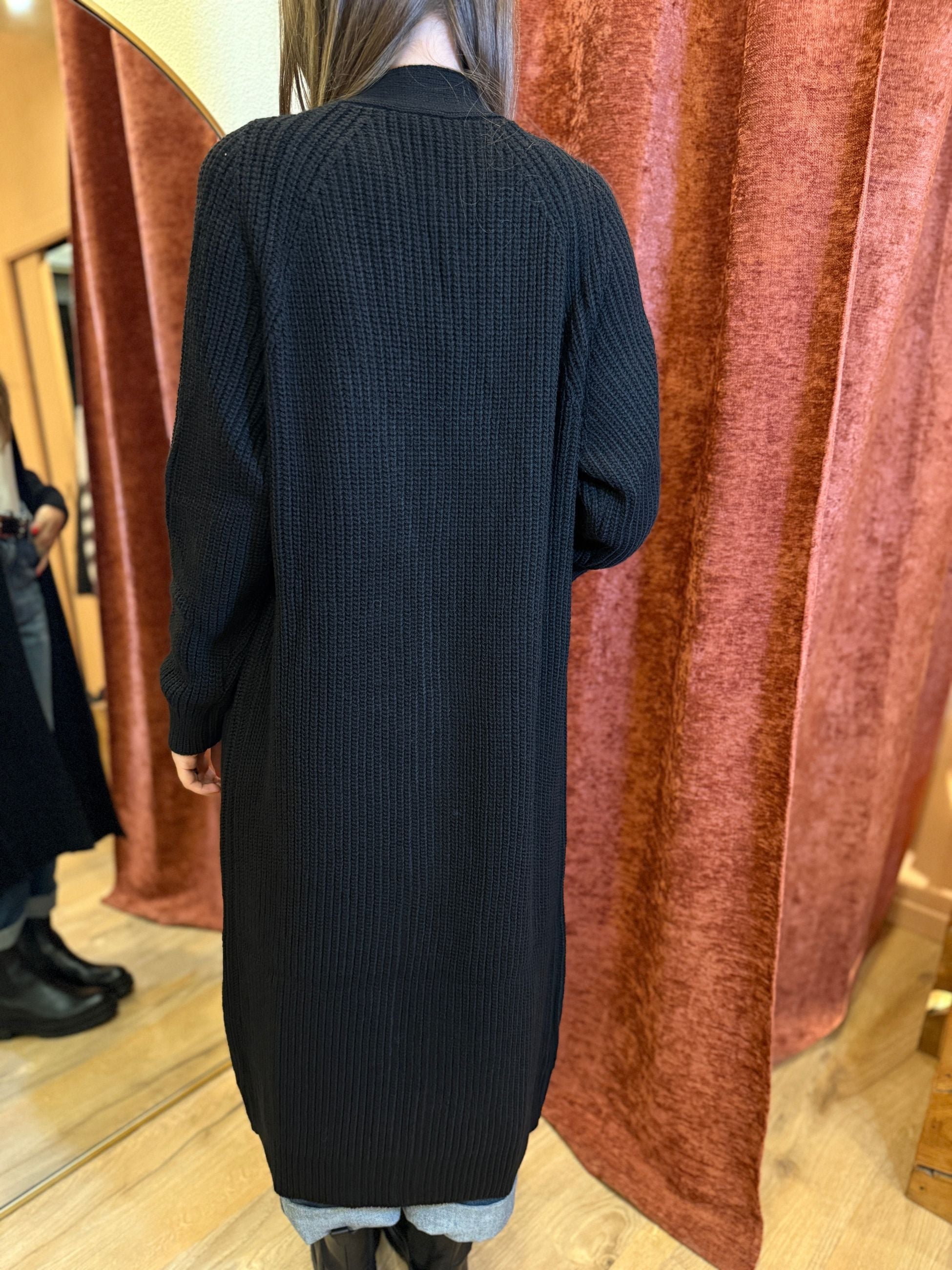 Cardigan lungo in maglia a costine, dal design essenziale e raffinato. La lavorazione a costine verticali slancia la figura, mentre la lunghezza extra aggiunge un tocco avvolgente e sofisticato al look.