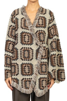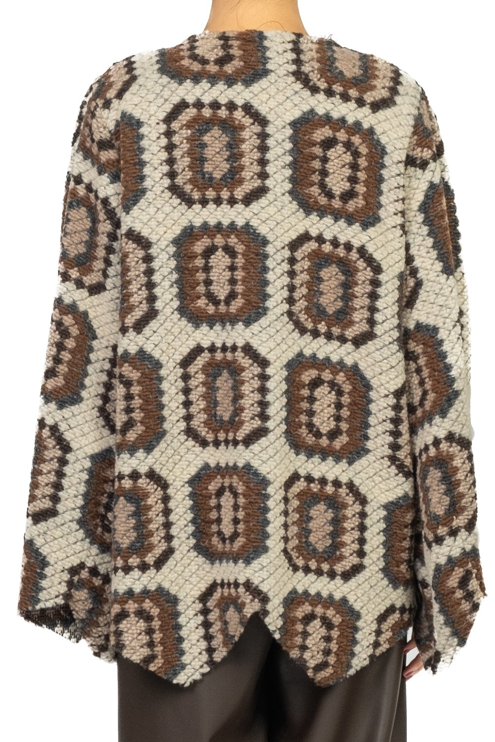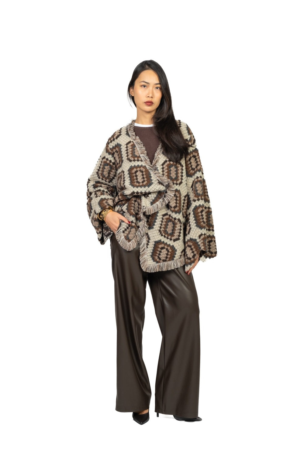 Cardigan donna dal design unico e ricercato, questo caban unisce linee asimmetriche e dettagli sfrangiati per un effetto contemporaneo e raffinato. La fantasia dona movimento e carattere al capo, mentre la chiusura con spilla aggiunge un tocco originale e distintivo.