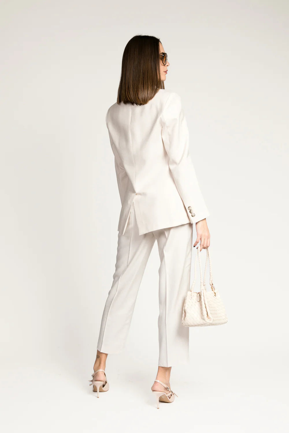 il suo taglio pulito e la linea slanciata si abbinano perfettamente sia al pantalone a sigaretta, che al pantalone a palazzo. Entrambi i pantaloni, se abbinati alla giacca, offrono stili distinti ma altrettanto raffinati, adattandosi a diverse occasioni e preferenze di stile