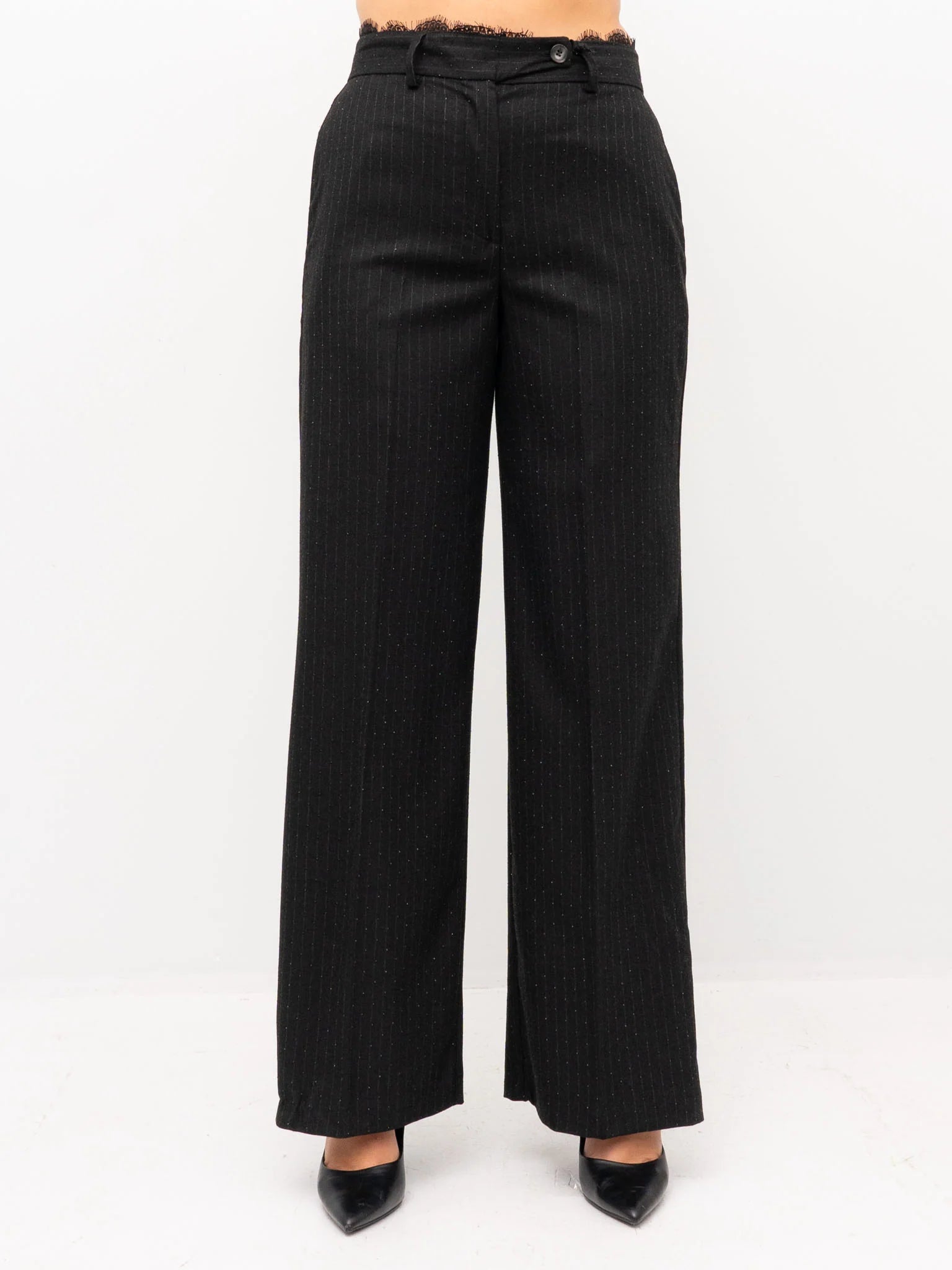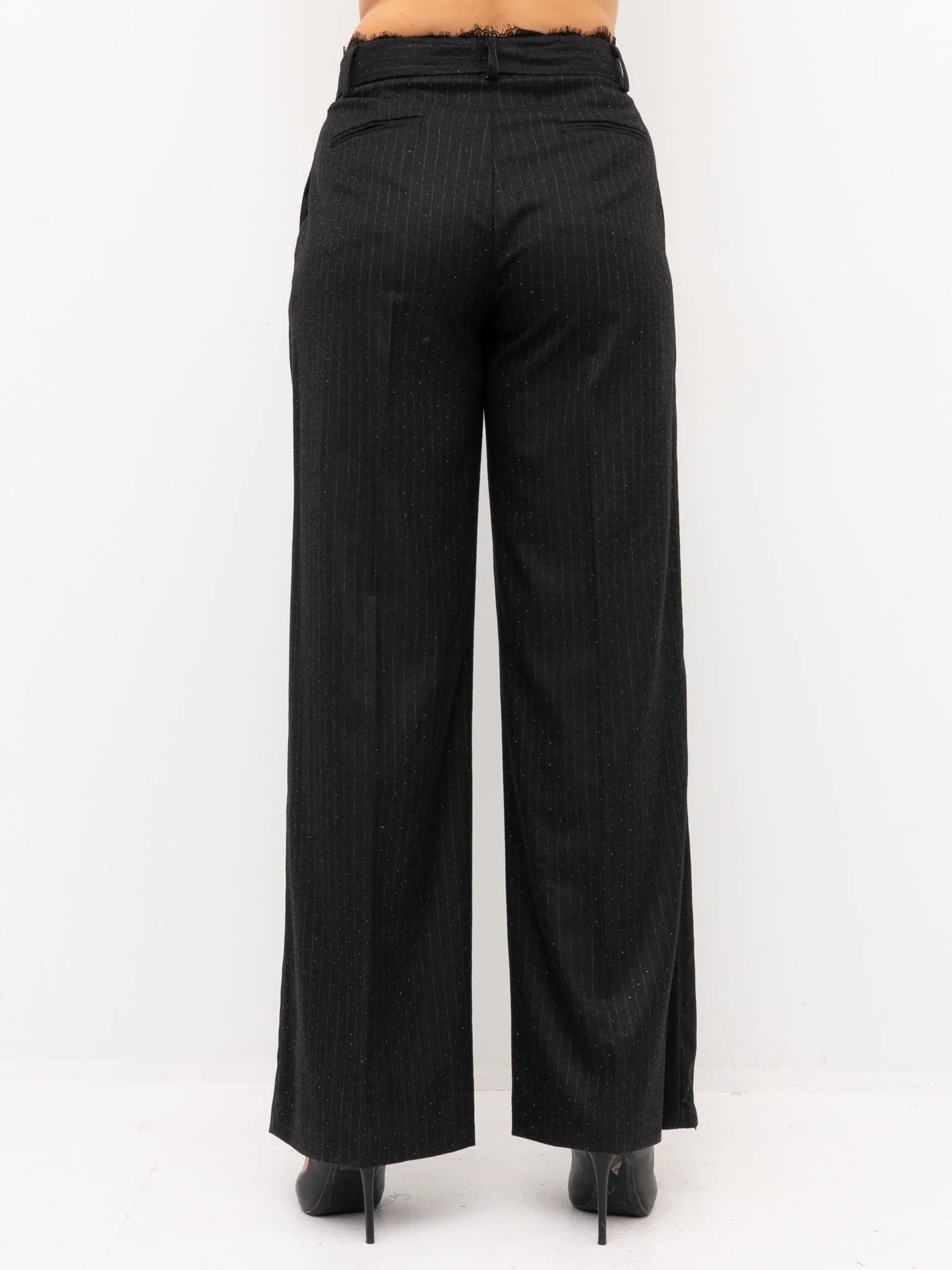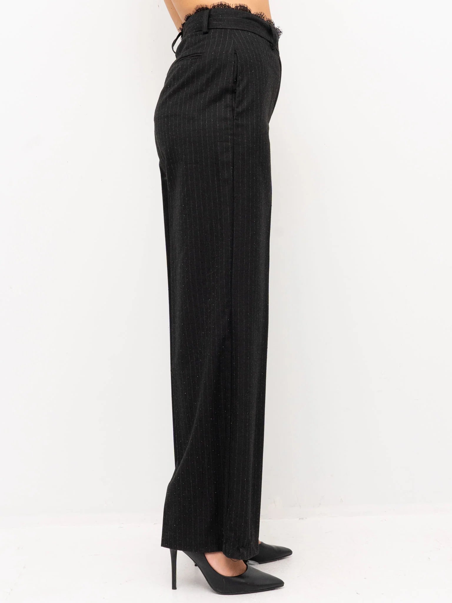 Pantalone donna a palazzo con strass all-over, inserto in pizzo sul girovita, chiusura frontale con cerniera e bottone, due tasche sul davanti e due finte tasche sul retro, passanti in vita